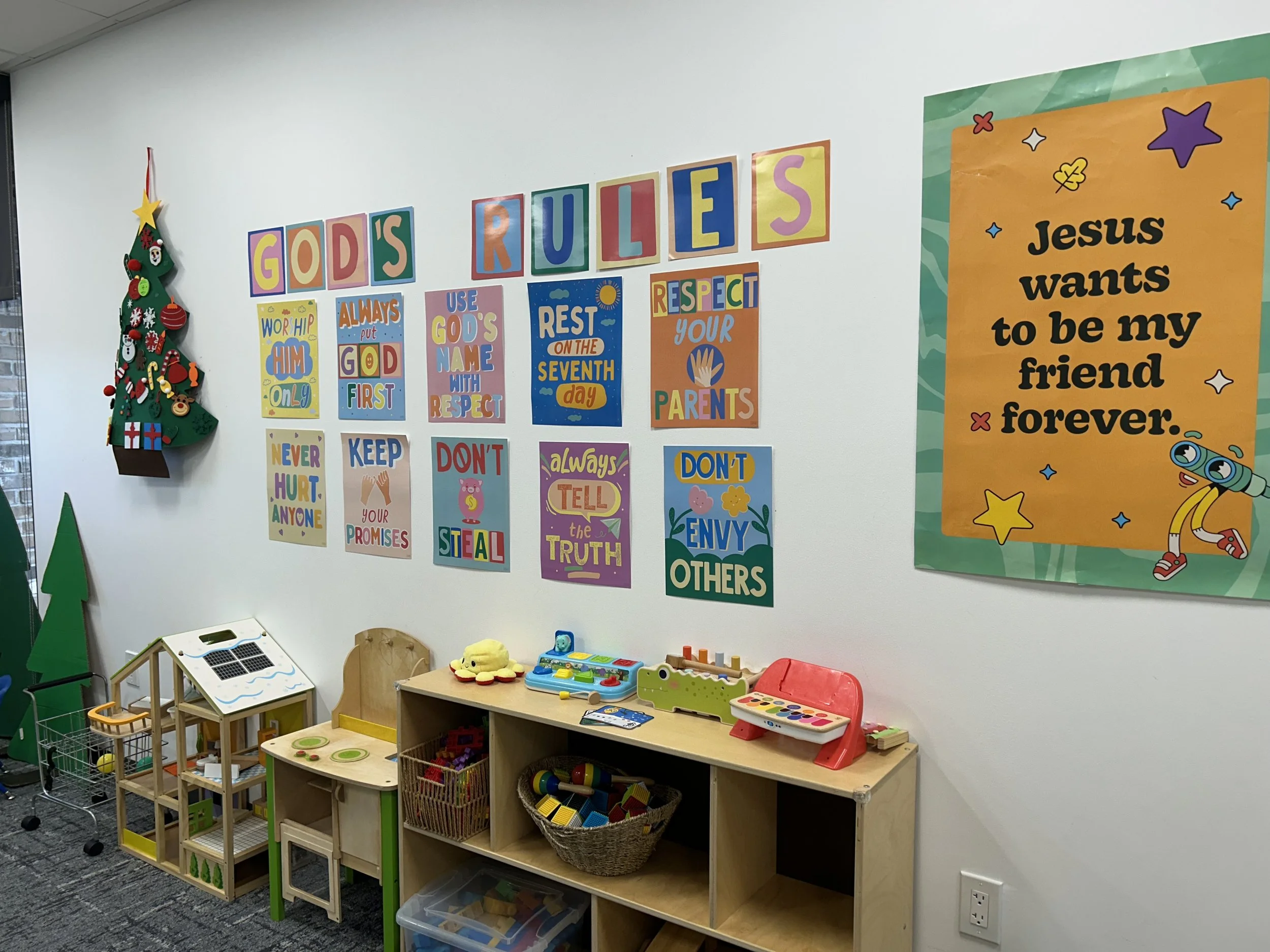 Nuestra guardería está disponible desde las 10:00 a.m. y permanece abierta durante la Escuela Dominical y el Servicio Eucarística, atendiendo a niños de 3 meses a 5 años.